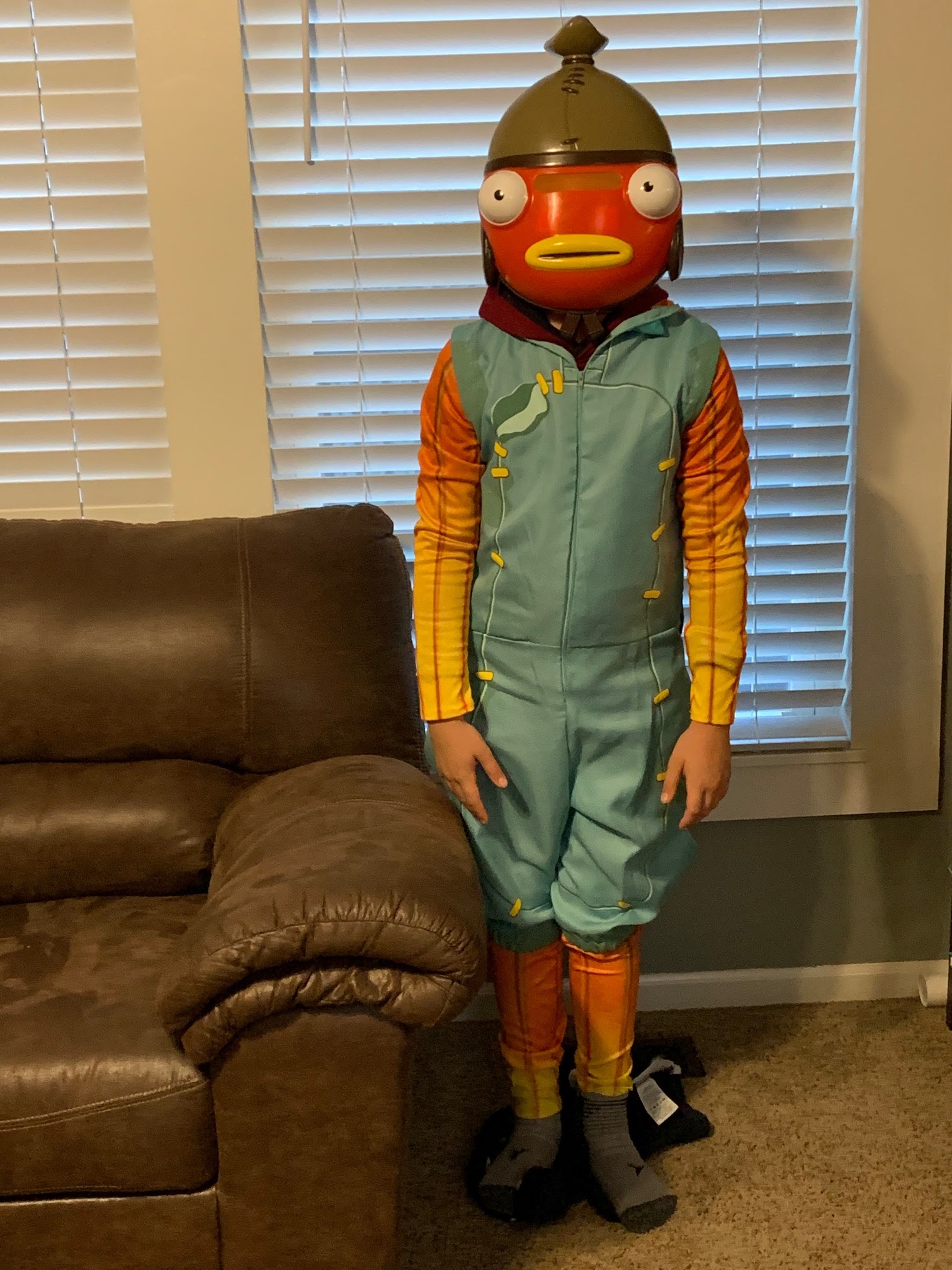 Macen headed off to spend the evening with friends. He is in a morph tuxedo suit. It's both creepy and hilarious! Maddox and I walked the neighborhood. There weren't as many houses handing out candy and we didn't have as busy of a neighborhood this year. Maddox is Fishstick from Fortnite.